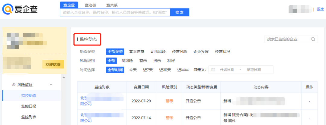 另外,爱企查还有一项风险监控功能,只需将某一家公司添加到监控企业名单中,平台便可智能监控目标企业,实时推送工商、司法、经营风险等动态信息,让你不再错过任何一个重要情报。