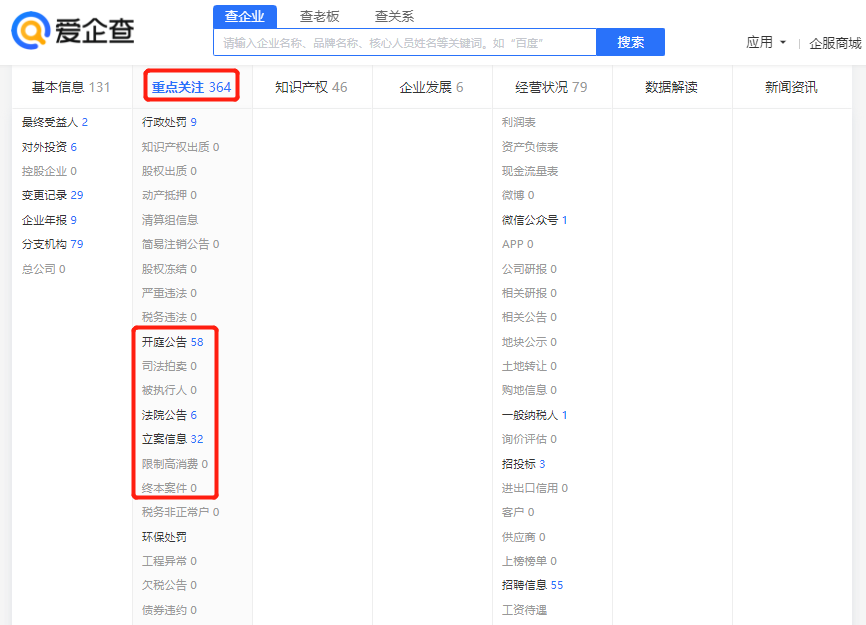 此外,爱企查的重点关注一栏里还有开庭公告、司法拍卖、被执行人、法院公告、立案信息、限制高消费、终本案件等众多信息,能帮助律师和普通人从开庭一直到结案,全方位了解目标企业的所有案件详情。