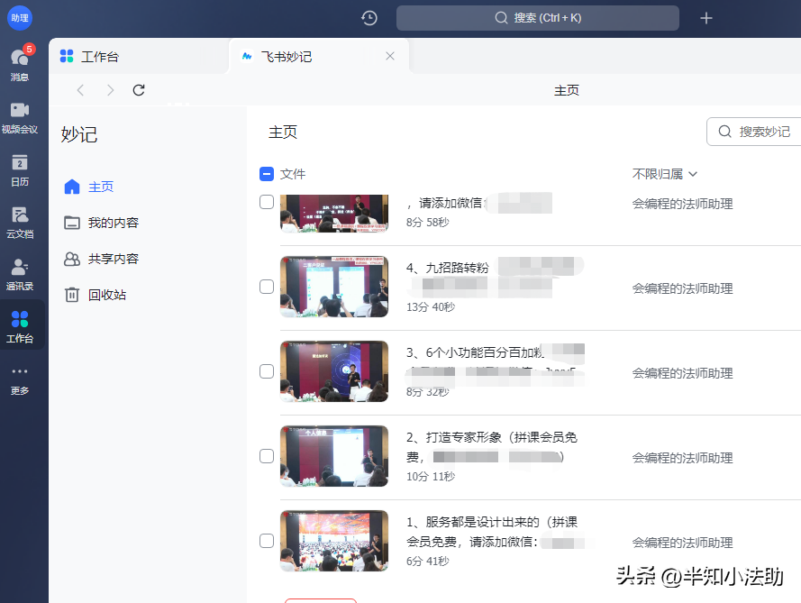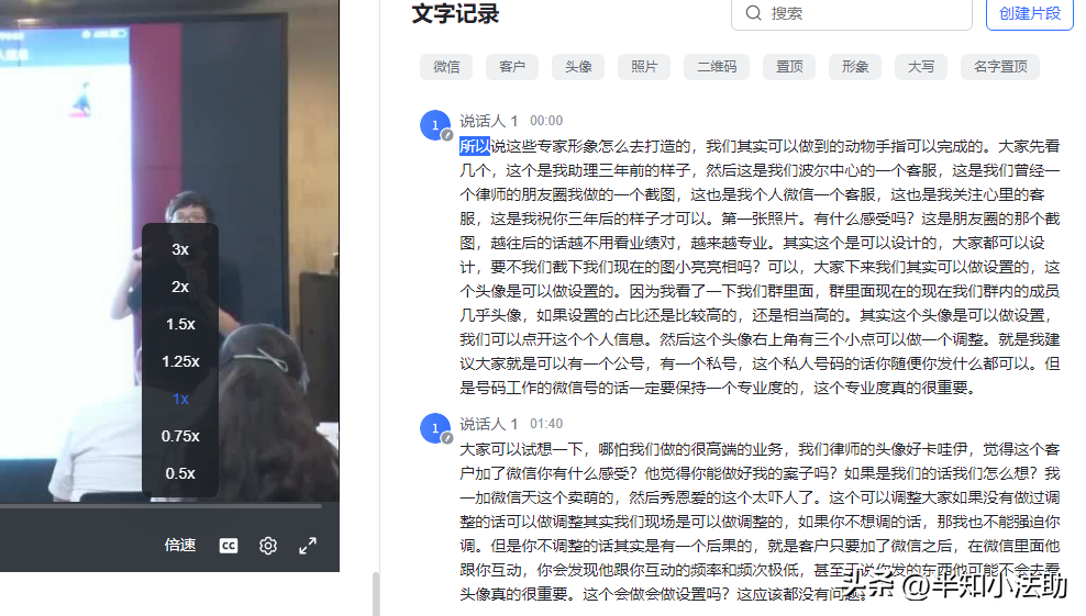 飞书是字节出的一款协同办公软件,里面有很多宝藏功能可以发掘。本人最常用的是飞书妙记,可以免费将音频、视频转为文字。对于学习各种视频课程简直不要太爽了,上传上去,直接转化为文字,然后3倍速听课。示例是小伙伴分享给我的某超级大所的营销课程,看看,感觉是不是很棒,直接把文字识别出来了,看文字就可以了,再也不用费神去听课了。