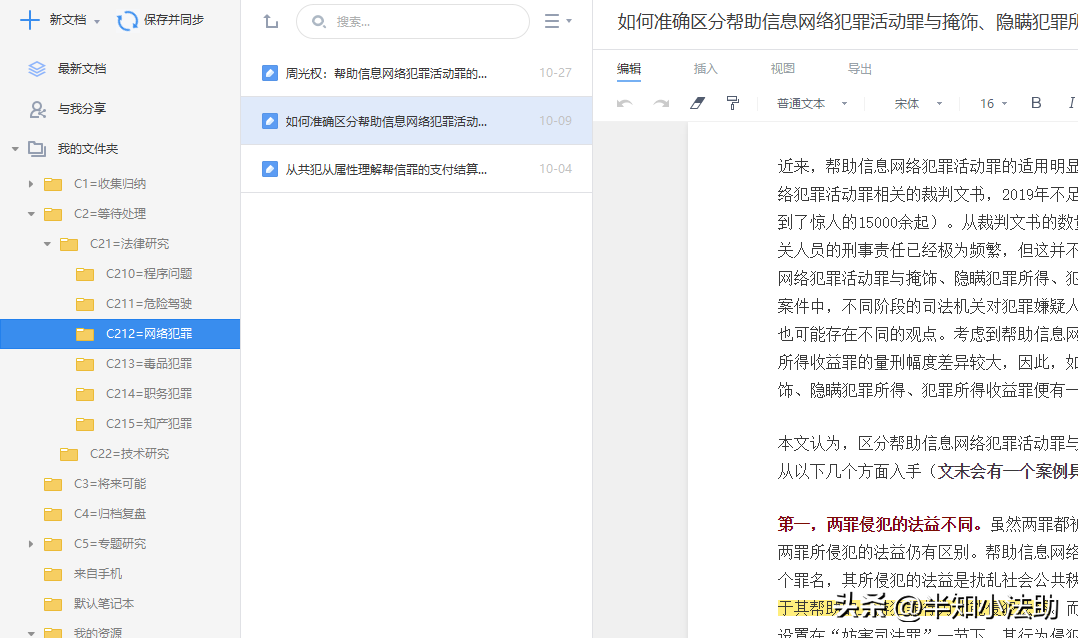 有道云笔记可以用来进行碎片知识管理,法律人每天看见很多别人写得很好的公号文章,怎么把这些文章收集下来进行管理呢?有道云笔记就是一个很好的工具。利用有道云笔记可以随时收集各种优质公号文章,即使文章后面被删除了,也不会影响你。收集了之后,可利用多级目录和多级标签来进行知识管理。关于如何进行知识管理,以后有时间再来细说,本次只介绍工具。