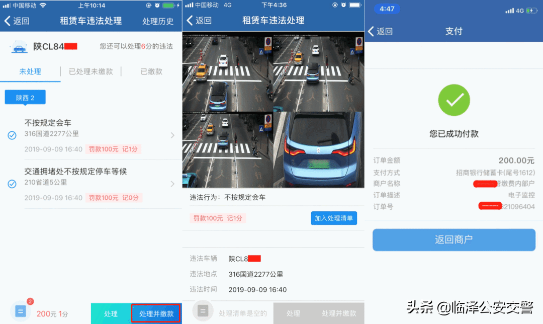 点击【交通违法记录】可以查看交通违法详细信息及证据照片等信息,选择需要处理的交通违法记录,点击【处理并缴款】,处理违法并缴纳罚款。
