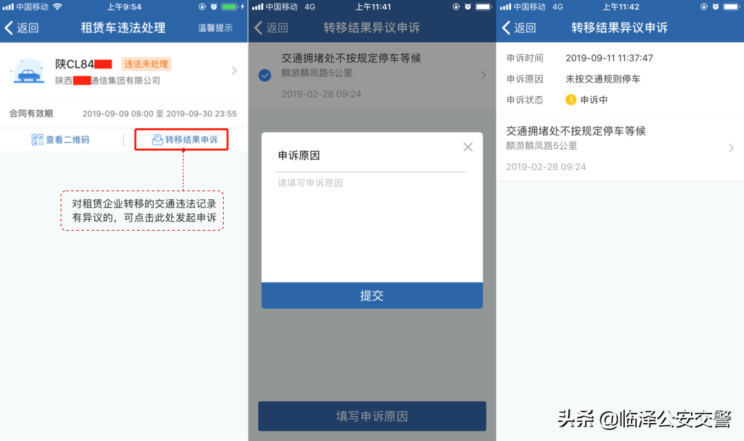 点击【租赁车违法处理】功能,选择【转移结果申诉】按钮,选择申诉的交通违法记录,采集申诉原因,提交申诉,等待审核结果即可。
