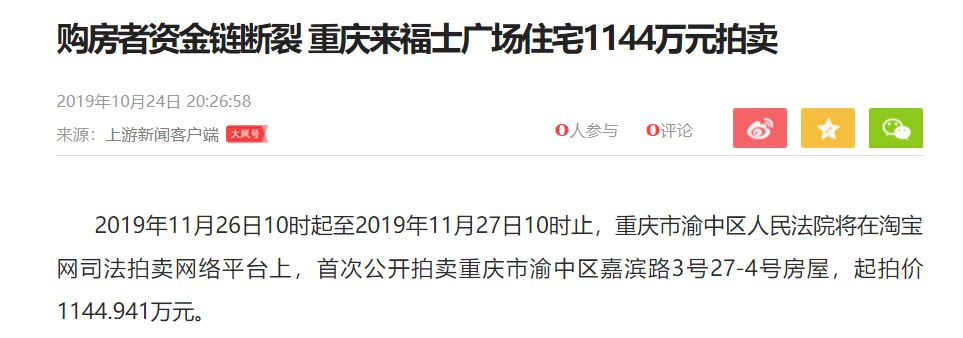 最近,有条新闻引起不少关注:来福士一住宅因购房者资金链断裂,无力偿债,而被债权人银行申请法院强制拍卖。2019年11月26日10时起至2019年11月27日10时止,重庆市渝中区人民法院将在淘宝网司法拍卖网络平台上拍卖,起拍价1144.941万元。