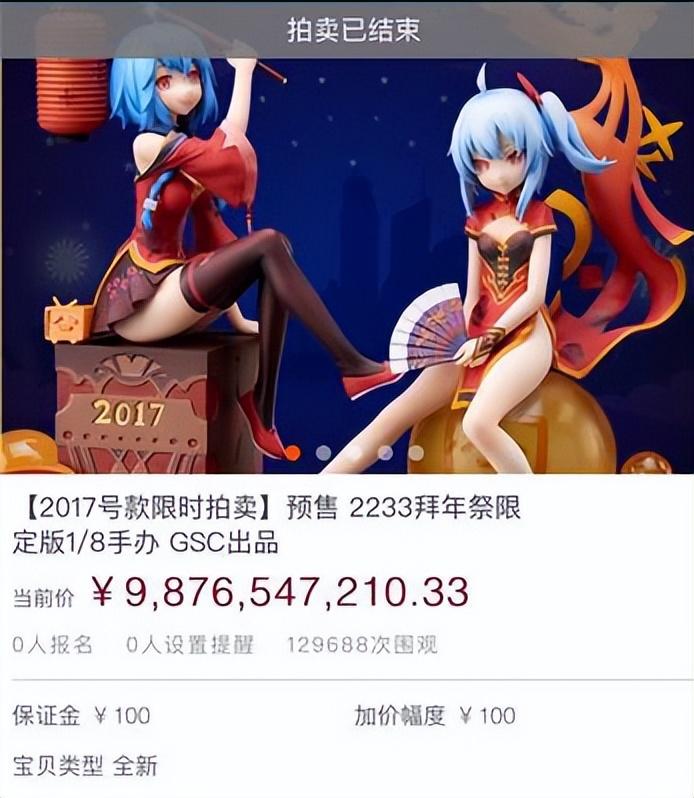 其实买不起就掀桌子的事情在以前也不是没出现过,比如去年6月的司法拍卖就出现过青眼白龙卡牌被拍出87326098元的天价。如果嫌这个价格不够高的话,2017年1月23日晚,哔哩哔哩曾在淘宝拍卖上架四款特殊编号的2233娘手办。其中编号“2017”的一组手办在经过一晚上与今天类似的疯狂抬价,最后以98亿的天价落槌成交。
