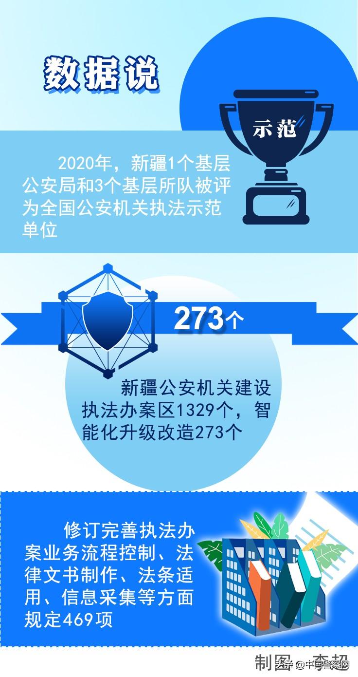 新疆还深入推进执法规范化建设,由新疆维吾尔自治区公安厅研究起草,联合自治区人民检察院、自治区高级人民法院会签下发的《适用取保候审措施的规定》《适用监视居住措施的规定》,被评为2019年全国公安机关优秀刑事执法制度。2020年,新疆1个基层公安局和3个基层所队被评为全国公安机关执法示范单位。新疆公安机关积极开展执法办案系统建设,建设执法办案区1329个,智能化升级改造273个;修订完善执法办案业务流程控制、法律文书制作、法条适用、信息采集等方面规定共469项。