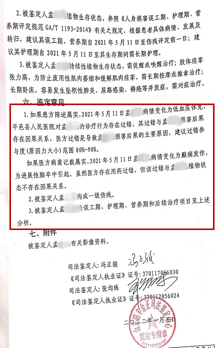 2022年1月5日,山东银丰金正司法鉴定意见中心作出的司法鉴定意见书称,2021年11月15日,医患双方均认可孟钎仍为“持续性植物生存状态”,事发后孟钎女儿认为他是发生低血压休克,医方认为他是癫痫发作,根据现有材料,他当时病情发生哪一种变化,无法确认。