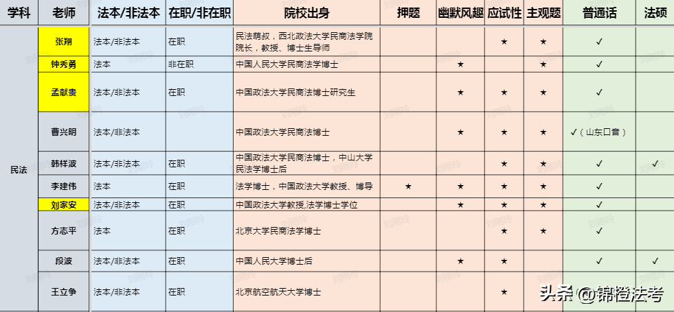 为帮助大家节省备考时间,避免走入跟错老师的误区,橙子花费了大量的时间整理并挨个听了不同老师的课程(谁叫咱吃这碗饭呢!)。我把市面上主流的民法老师按照幽默度(听不下去怎么学?)、院校出身(五院四系+清华更为接近命题思路)、适合考生群体(在职时间少,学生时间多)、应试性(干货多还是段子多?)、普通话(川普广普福建普,我真的需要字幕组)、是否讲主观题(案例举例和写作技巧)以及是否讲法硕(同时备考法硕的就不用换老师了)几个维度,对各位名师进行了较为系统的整理和分析,以帮助大家系统的了解目前市面上各个老师的特点和匹配的人群。