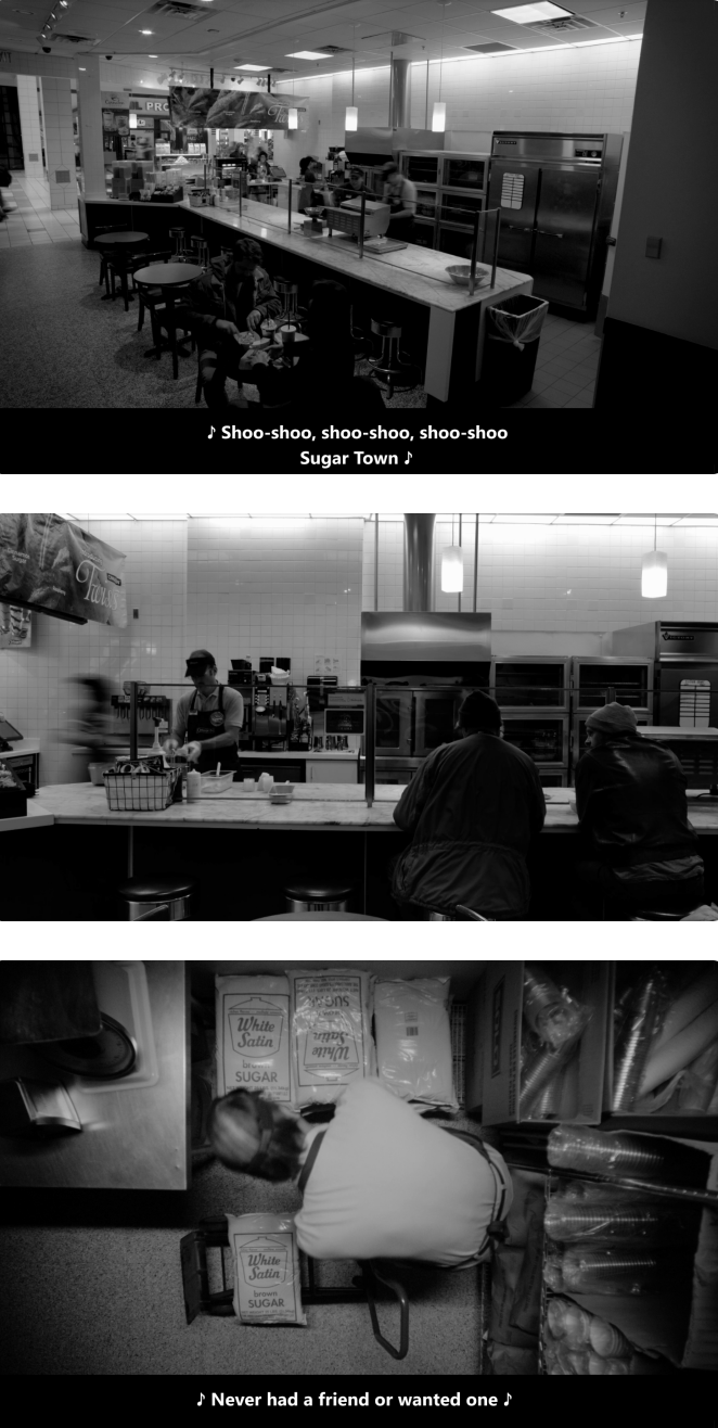 2、镜头7有一处彩蛋:吉恩进货的红糖与歌曲主题呼应(Sugar Town);用来进货的手推车也与当年老白可乐藏钱时用的手推车呼应。