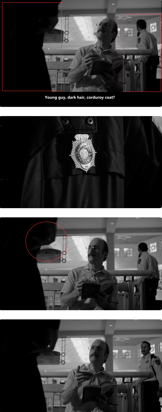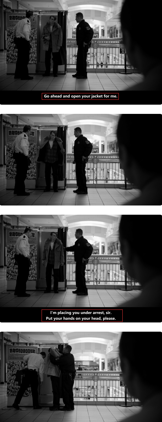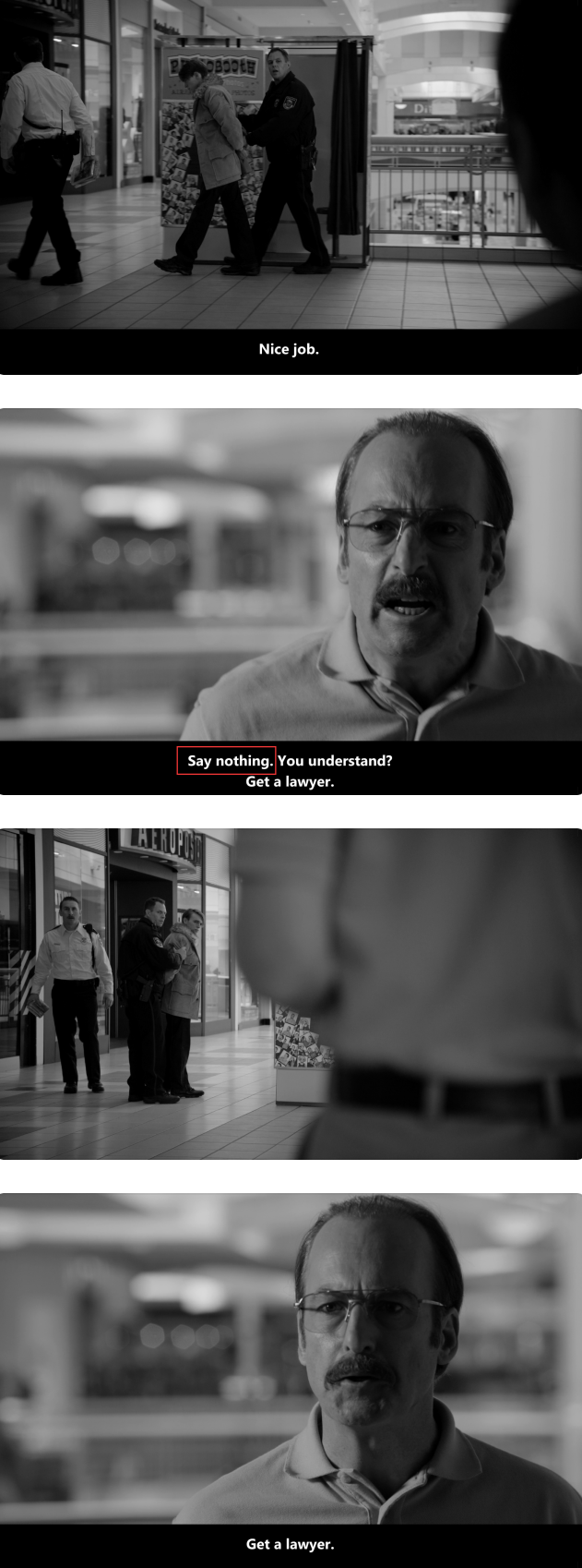 3、这两个镜头是本集的点题镜头,解答了“tape”隐喻陷阱的原因。巡警的执法过程颇为微妙,抓到“小偷”时并没有发现“脏货”。当巡警要求吓懵了的少年打开外套时,“tape”才掉落出来。这个执法过程违反了 “沉默权原则”(the right to silence)即:不能强迫证实自己有罪。(所以吉恩最后向少年大喊,say nothing,即提示他保持沉默权)