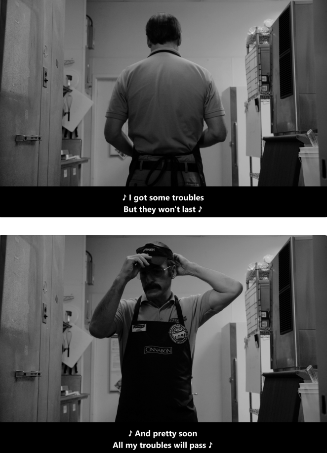 2、10秒镜头与歌词同步:“I got some troubles but they won’t last-(中略)-and pretty soon all my troubles will pass”(我惹上了一些麻烦但它们不会持续——很快我所有的麻烦都会过去)这是吉米的心愿,也是吉恩线剧情即将“急转直下”的作者戏谑。