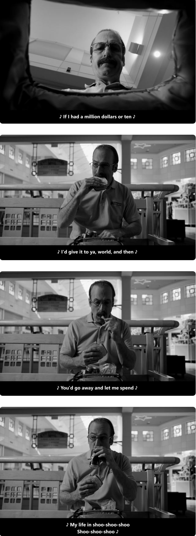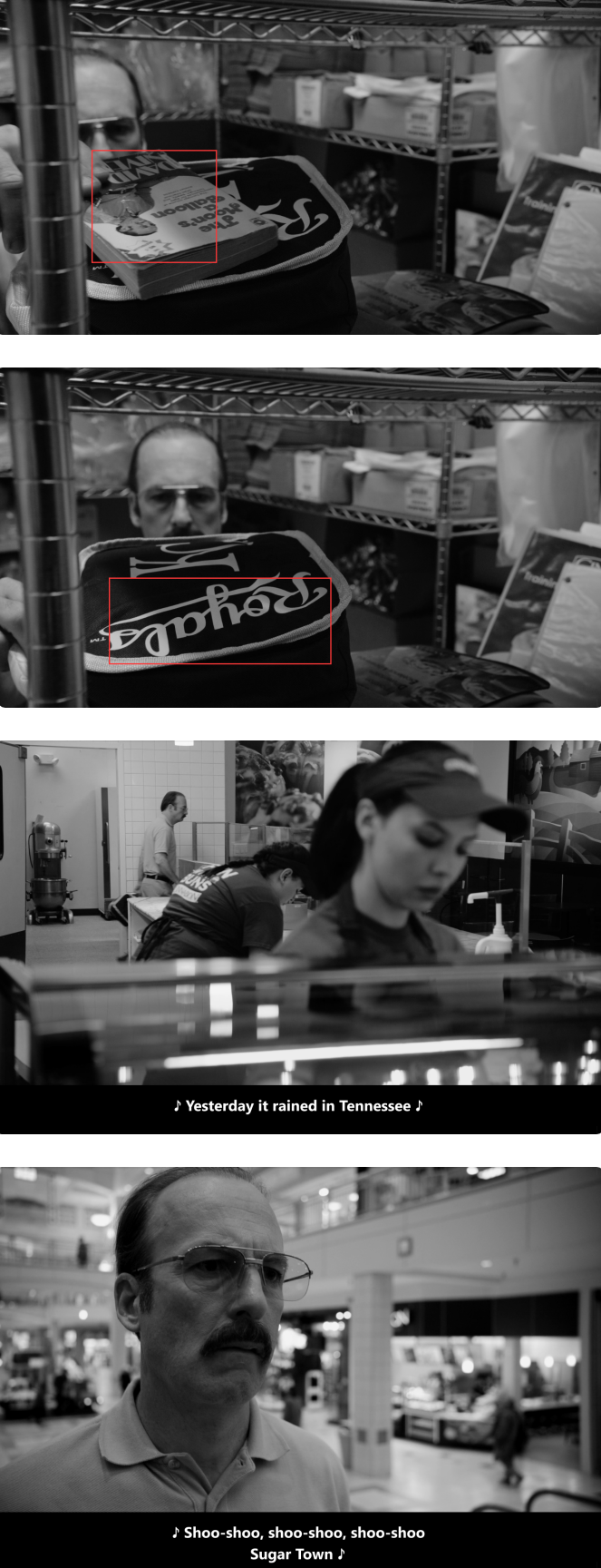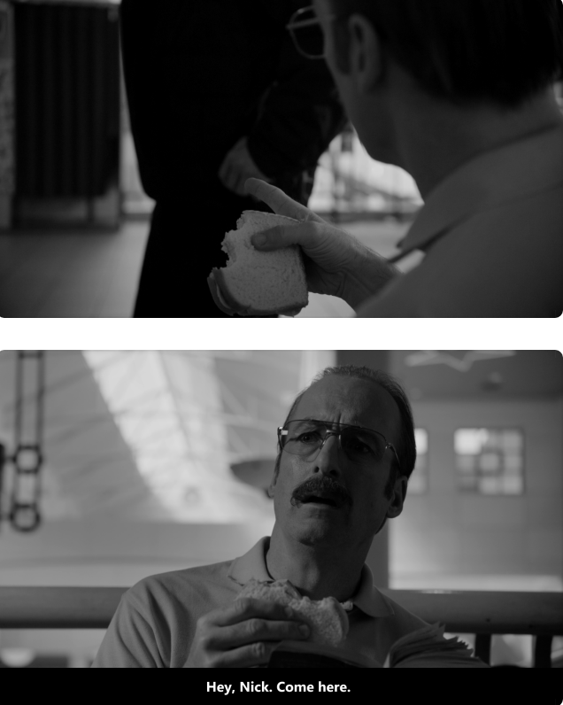 2、镜头17吉恩的午饭是一个三明治、一袋妙脆角、一罐可乐;拿起影帝回忆录,可以看到阅读已基本接近尾声。此处隐喻吉恩线也是吉米影帝人生(扮演索尔再扮演吉恩)的结尾。
