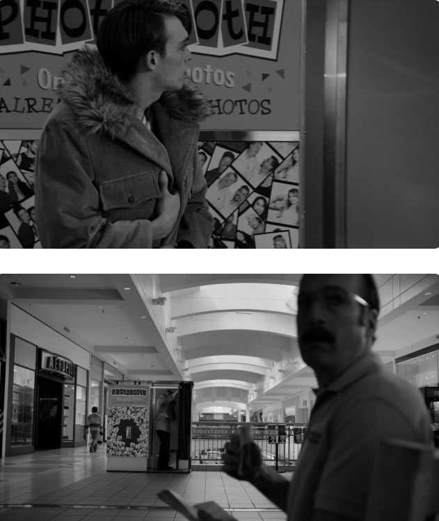 1、作者视角。少年走向画面右侧,音轨中对讲机声音就即刻响起,而左侧是少年的慌张来路,这提示两个方向都被堵死(巡警逼近)——走投无路的少年被迫躲在Photobooth拍立得机器前。这一切被吉恩看在眼里,意识到眼前的少年很可能是个“罪犯”。