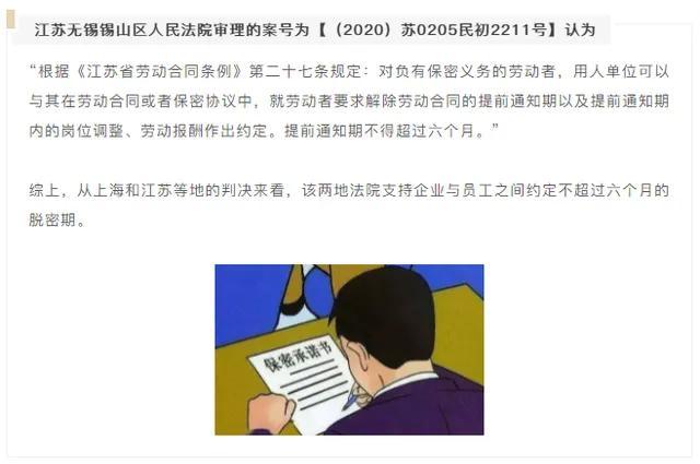 (4)《江苏省劳动合同条例》(江苏省人大常委会公告第124号)第二十七条规定,对负有保密义务的劳动者,用人单位可以与其在劳动合同或者保密协议中,就劳动者要求解除劳动合同的提前通知期以及提前通知期内的岗位调整、劳动报酬作出约定。提前通知期不得超过六个月。