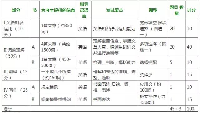 试题分四部分,共48题,包括英语知识运用、阅读理解、英译汉和写作。