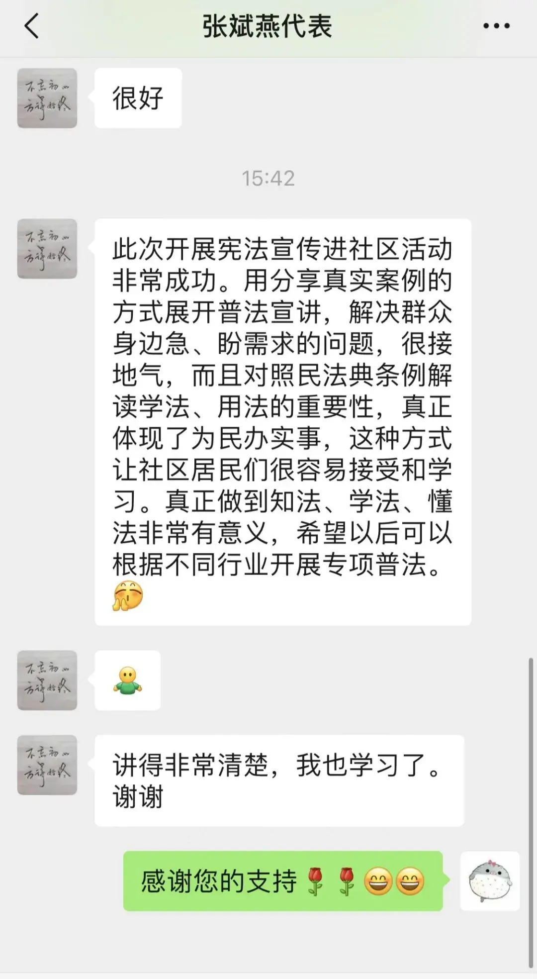 12月2日下午,北京一中院民二庭与八宝山街道联合开展宪法宣传周主题活动之《民法典》进社区系列活动,民二庭干警张丽君和鞠伟分别为八宝山街道辖区15个社区的社区工作者、志愿者和居民开展线上普法,针对百姓关心的相邻关系纠纷、电动车充电不当引发的法律问题等进行详细解答。多名市人大代表和政协委员受邀在线参与本次活动。市人大代表、北京市房山区西潞街道苏庄片区联合党委书记,苏庄三里社区党总支书记、居委会主任邵雪松专门组织其社区主管调解工作的社区工作者和调委会团队人员线上参与。