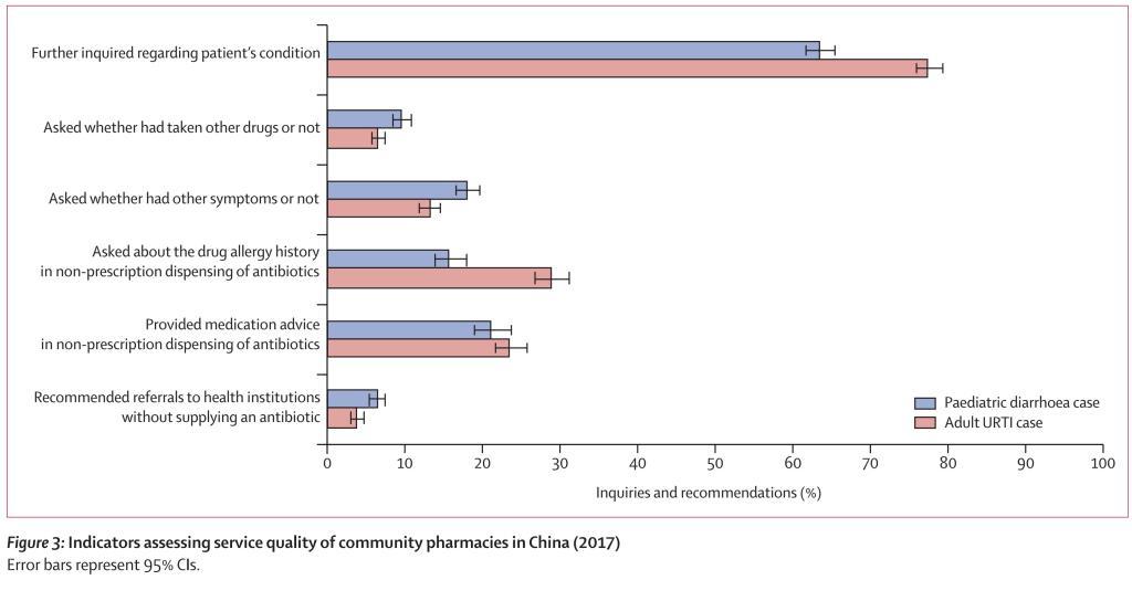 研究表明,针对以上两种病症,分别有48.5%和70.1%的受访药店不凭处方提供了抗生素,而该比例在不同地域、省份和城乡间均存在差异;不凭处方销售情况与有药师在岗执业、药店为连锁药店呈反向关系;药师在岗率仅为35%,药店提供的药学服务情况令人堪忧。