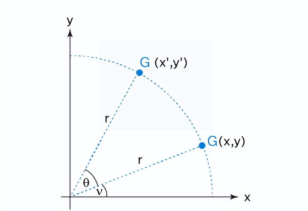 设 G 是 xy 平面中长度为 r 的向量,它与 x 轴形成角度 v。我们现在将 G 逆时针旋转角度 θ。如果 (x, y) 是向量 G 点起点为原始坐标,那么 (x', y') 将是旋转后的新坐标。