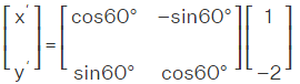 旋转矩阵将始终是方阵。由于旋转矩阵始终是正交矩阵,因此转置将等于矩阵的逆矩阵。旋转矩阵的行列式总是等于 1。旋转矩阵的乘法将产生一个旋转矩阵。如果我们取旋转矩阵的两行的叉积,它将等于第三行。一行与一列旋转矩阵的点积将等于 1。例1:如果A(1,-2)逆时针旋转60度,坐标值是多少?解决方案:利用这个公式