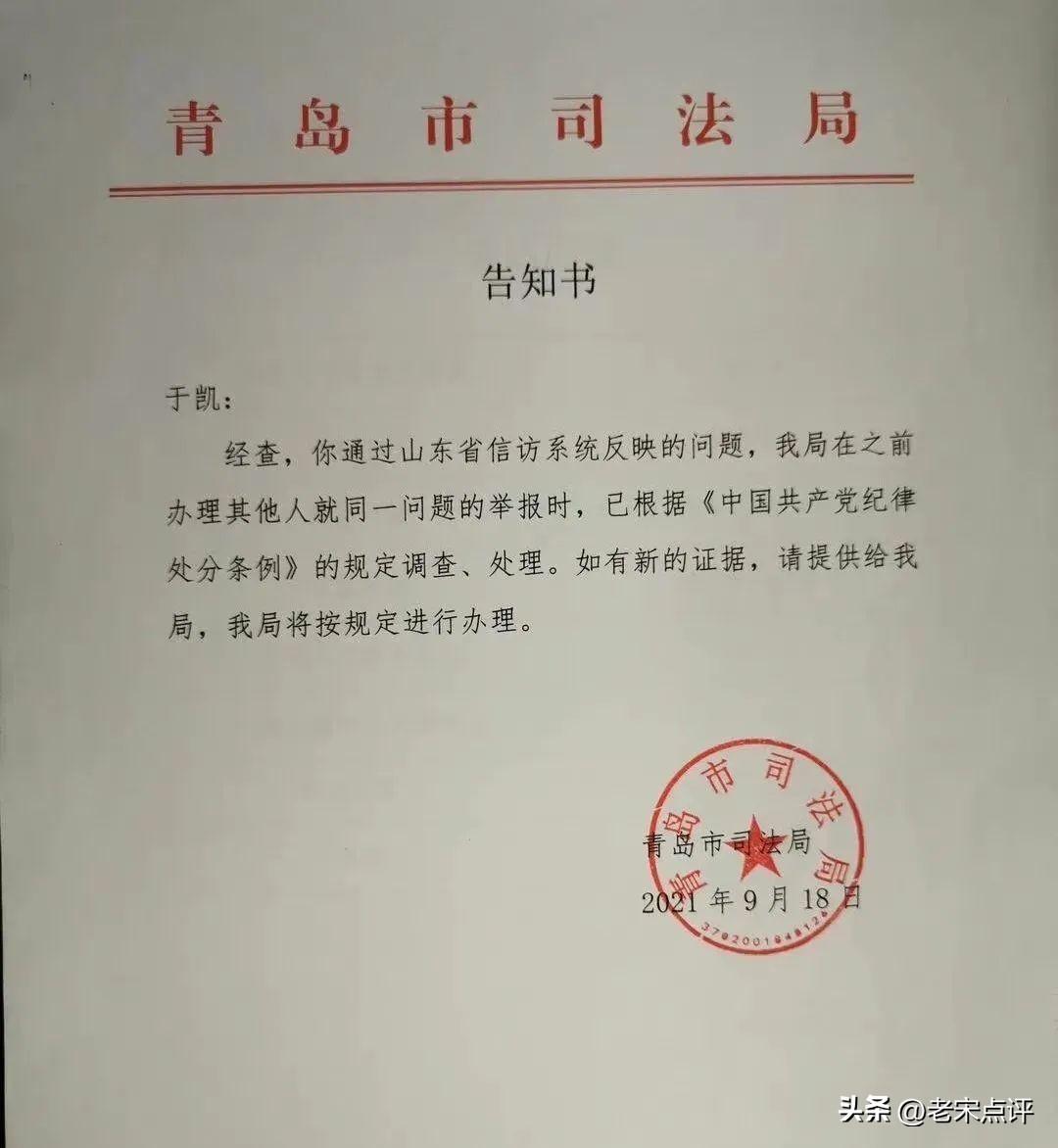 去年9月18日,青岛市司法局回复于凯举报称,已针对此事展开调查和处理。到了去年底,媒体记者从青岛市司法局相关负责人处获悉,针对张金海被举报事项,司法局已经调查处理完毕,“其向官员送5000欧元”的事实非常明了;青岛市司法局认为,张金海行为“肯定构成违纪”,已给予张金海党内警告处分。