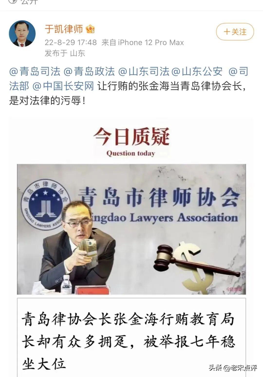 近年来,作为山东省青岛市律师协会会长的张金海,持续受到包括青岛律师于凯等人的实名举报。被举报的事项为“向青岛市教育局某官员行贿”。