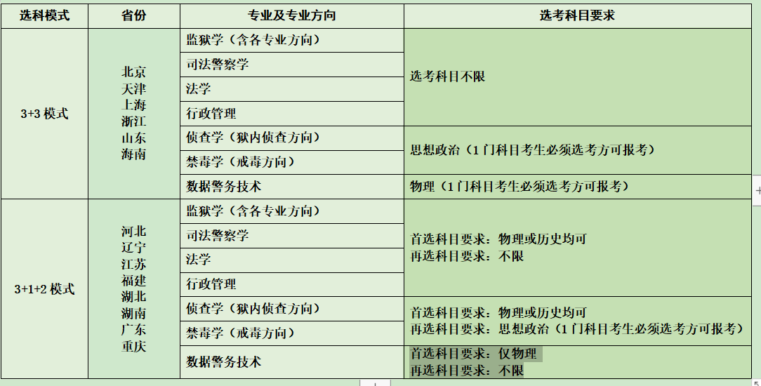 3+3高考模式下,北京,天津,上海,浙江,山东,海南这些省份,选监狱学,司法警察学,行政管理,是不限制高中选科的。
