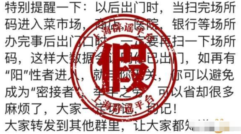 近日,在网络中流传着一则“特别提醒”:“进入菜市场、商店、医院、银行等场所办完事后出门时,一定要再扫一下场所码,这样大数据就会证明你已出门,如果再有阳性病例进入就与你无关,可以避免成为密接者……大家一定要转发!”