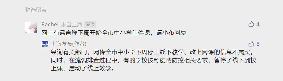 在“上海发布”10月9日发布的《上海新增社会面2例本土确诊病例,三地列为中风险区》一文下,有网友提问:网上有谣言称下周开始全市中小学生停课,请小布回复。