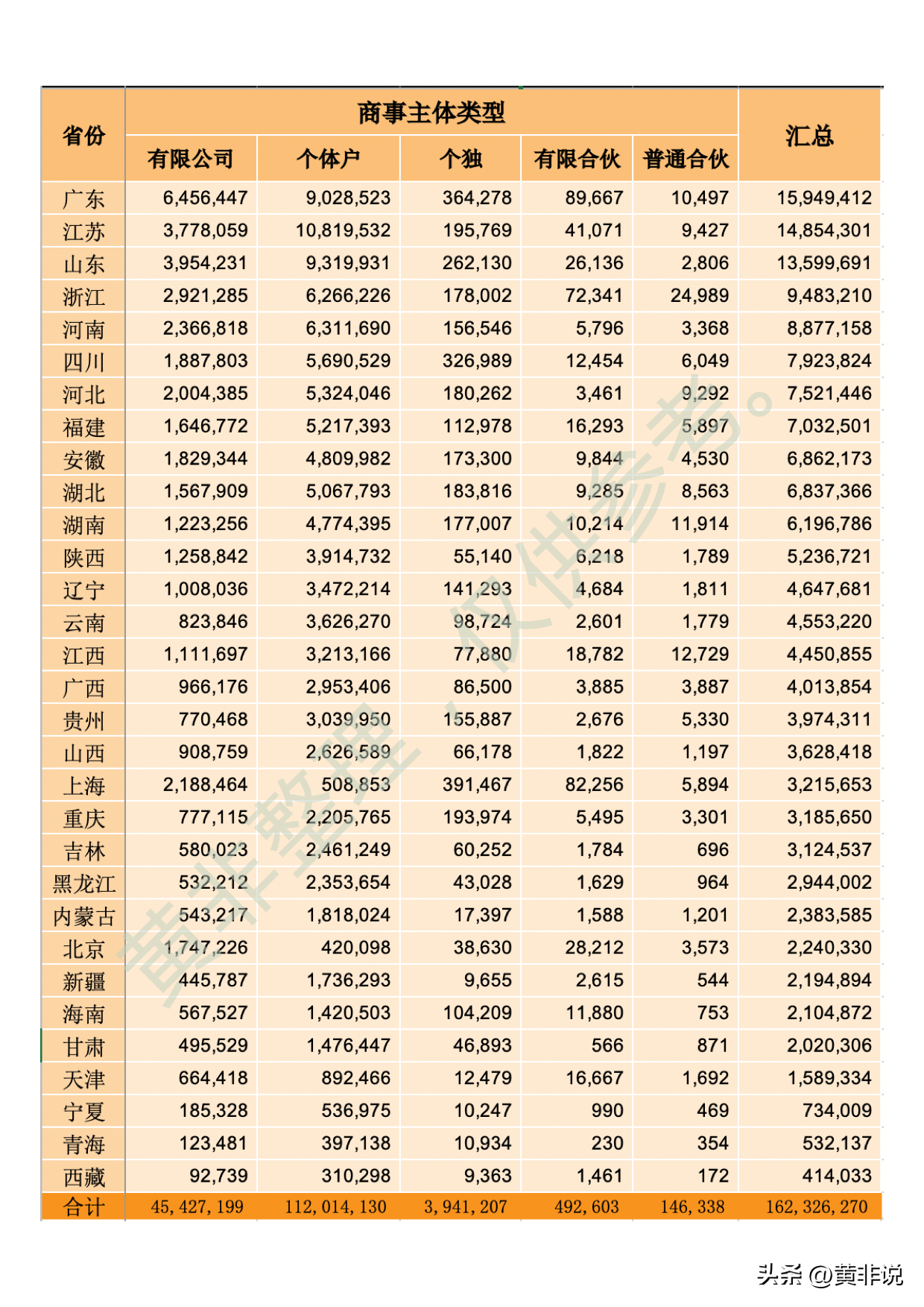 注:本数据系存量数据,不含注销吊销数据,非官方数据,仅供参考从表中可得知,全国个独数量仅占个体户数量的3.52%,也就是说每注册28家个体户才会有注册1家个独,可见两者数量之悬殊。相对于公司而言,个独的数量也不到其10%,可见,公司的商事主体相对于个独来说,也是更加欢迎的。