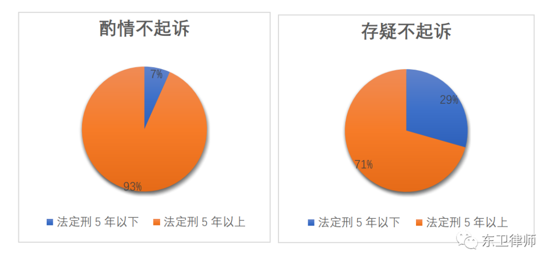 酌定不起诉涉案金额低,法定刑基本在5年以下;存疑不起诉涉案金额高,法定刑多在5年以上。