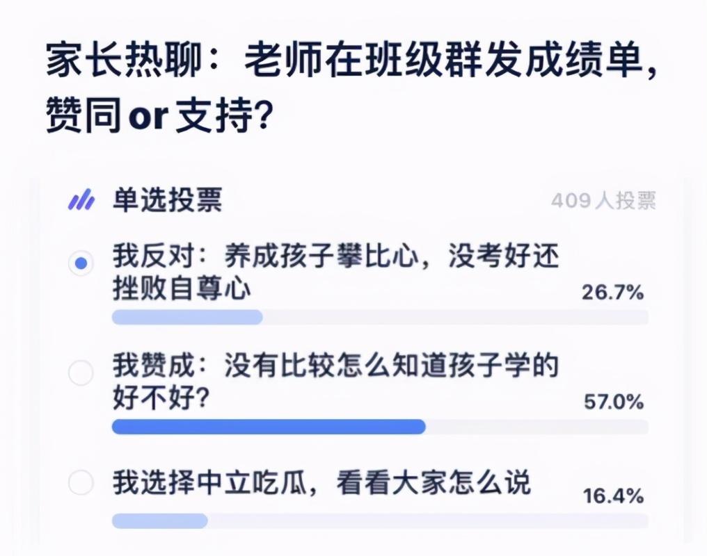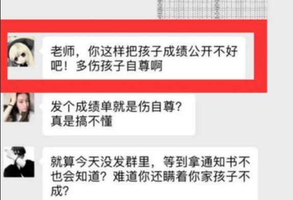 甚至有网友分析了上面扬言要举报的家长的心态,部分家长之所以不愿意老师在家长群里公布成绩,是因为他们真的在乎孩子的隐私吗?恐怕更多的是家长觉得,在家长群里让别人看到自家孩子的成绩会觉得丢脸,说白了就是家长的自尊心在作祟。