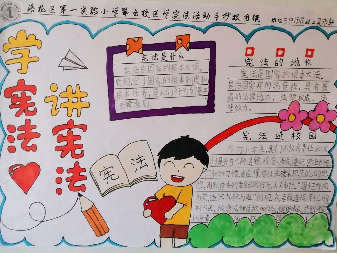 三年级学生通过写、画学宪法主题手抄报的形式向全校同学宣传宪法知识。