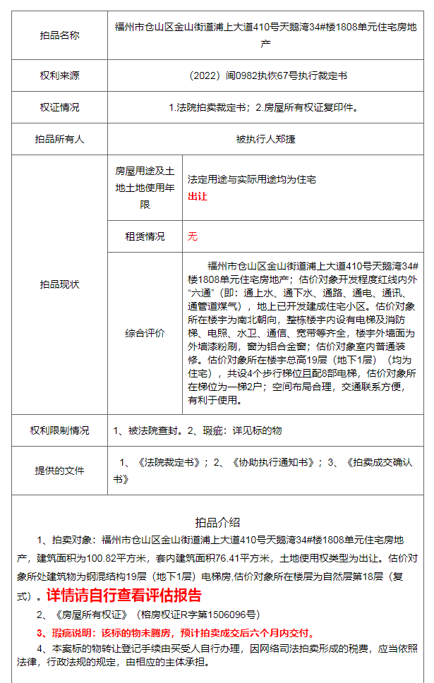 一拍 福州市仓山区金山街道浦上大道410号天鹅湾34#楼1808单元住宅房地产