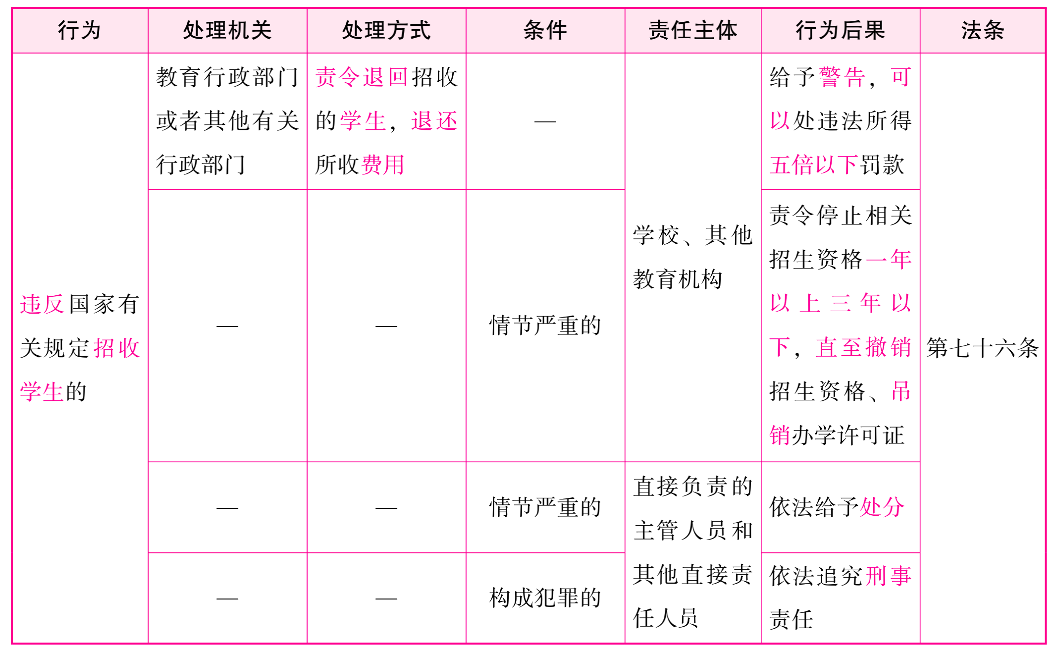 学校或者其他教育机构违反国家有关规定招收学生的,由教育行政部门或者其他有关行政部门责令退回招收的学生,退还所收费用;对学校、其他教育机构给予警告,可以处违法所得五倍以下罚款;