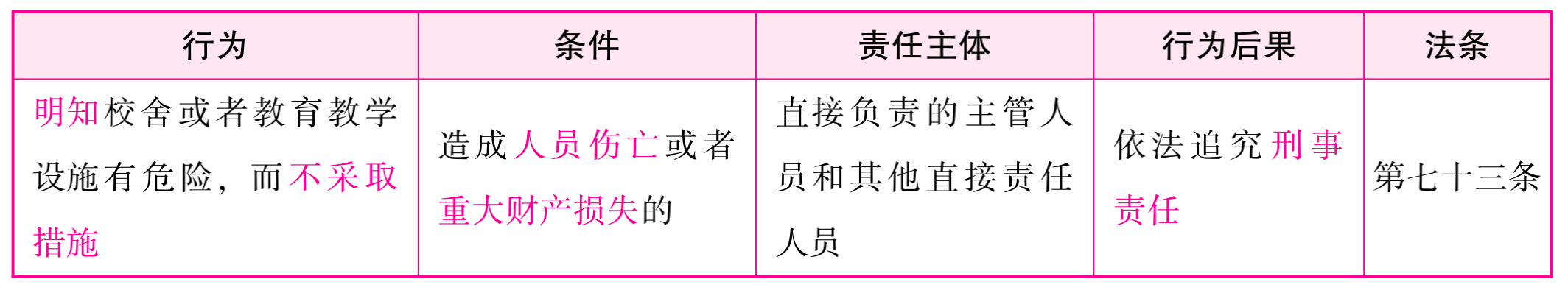 明知校舍或者教育教学设施有危险,而不采取措施,造成人员伤亡或者重大财产损失的,对直接负责的主管人员和其他直接责任人员,依法追究刑事责任。