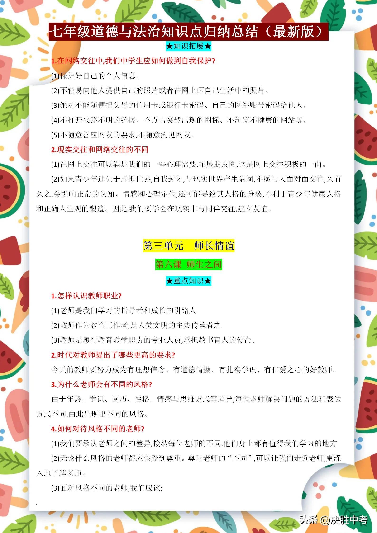 为了让大家更好的学习道德与法治,在此,我也是将七年级道德与法治的重要知识点和考点做了一个归纳总结,想做尖子生,抓紧打印吧!