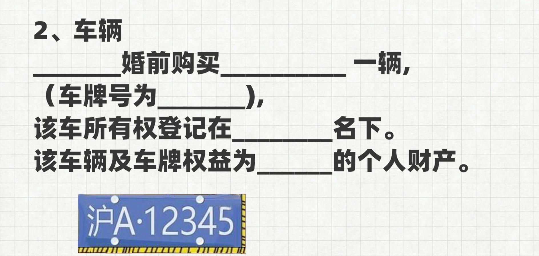 写明品牌车型和车牌号就可以了。车牌本身有价值的,也可以将车牌归属补充进去。如果存在车贷的,那么也可以参考房贷的格式,来约定一下。