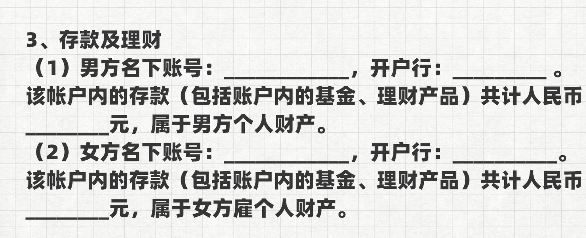 写清楚账户信息,以及目前的资金总额就可以了。这部分其实写不写问题不大,婚前财产在法律上本来就是个人财产。