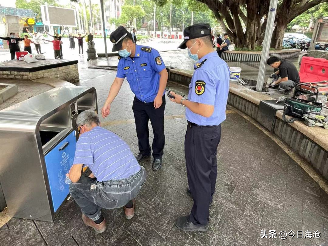 在法治公园整治现场,执法人员发现一位大爷抽完烟随手往地上一扔就走,立即上前劝导。
