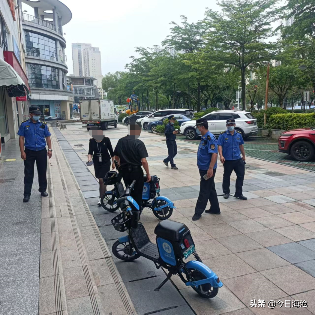 执法人员发现天虹商场前有一些共享电动车随意停放,立即责令物业将车停放在指定地点。