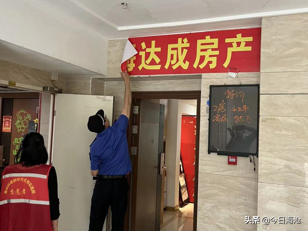 某房产中介在店面违规贴上广告贴纸,执法人员告知店家,并现场拆除。