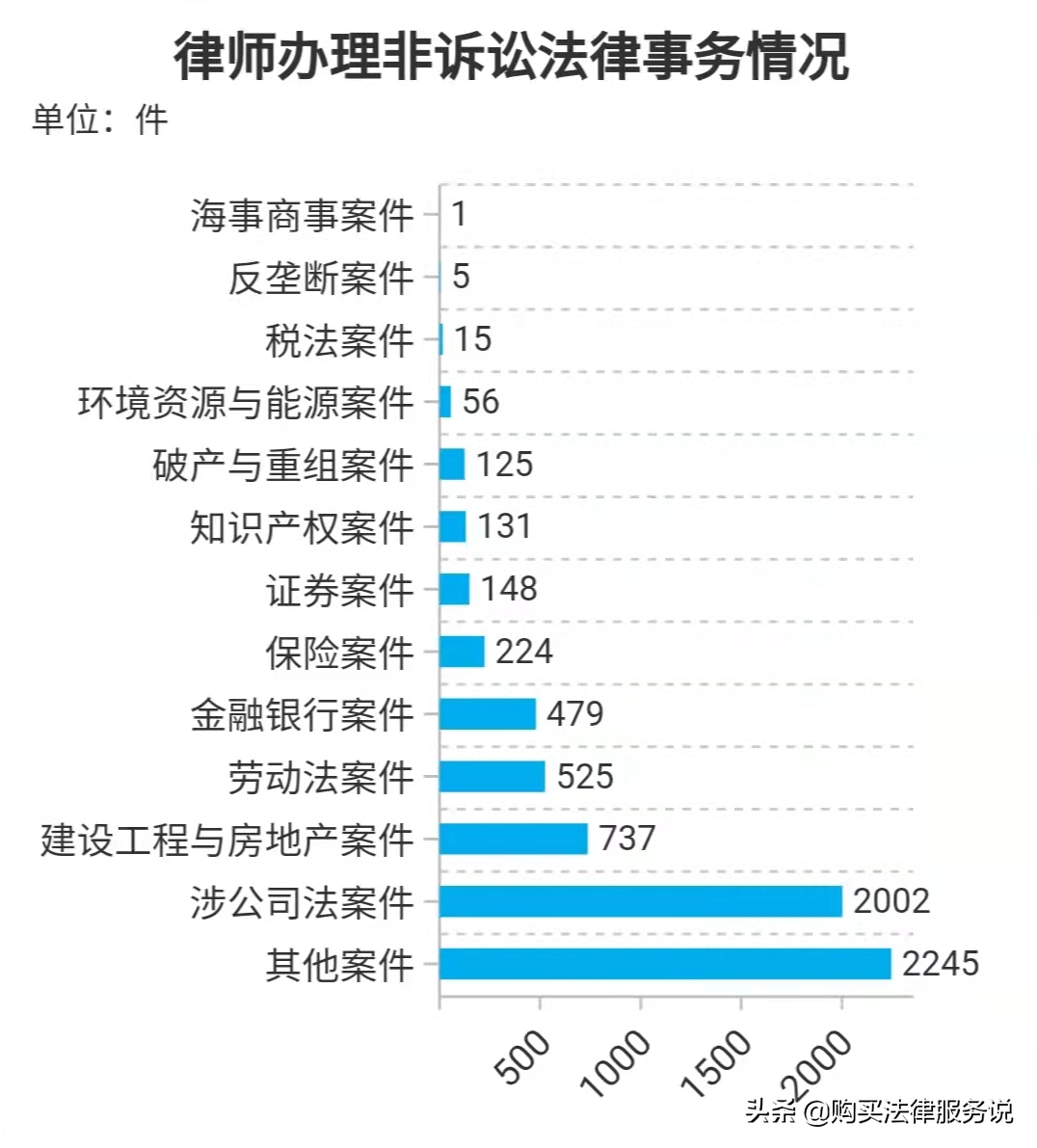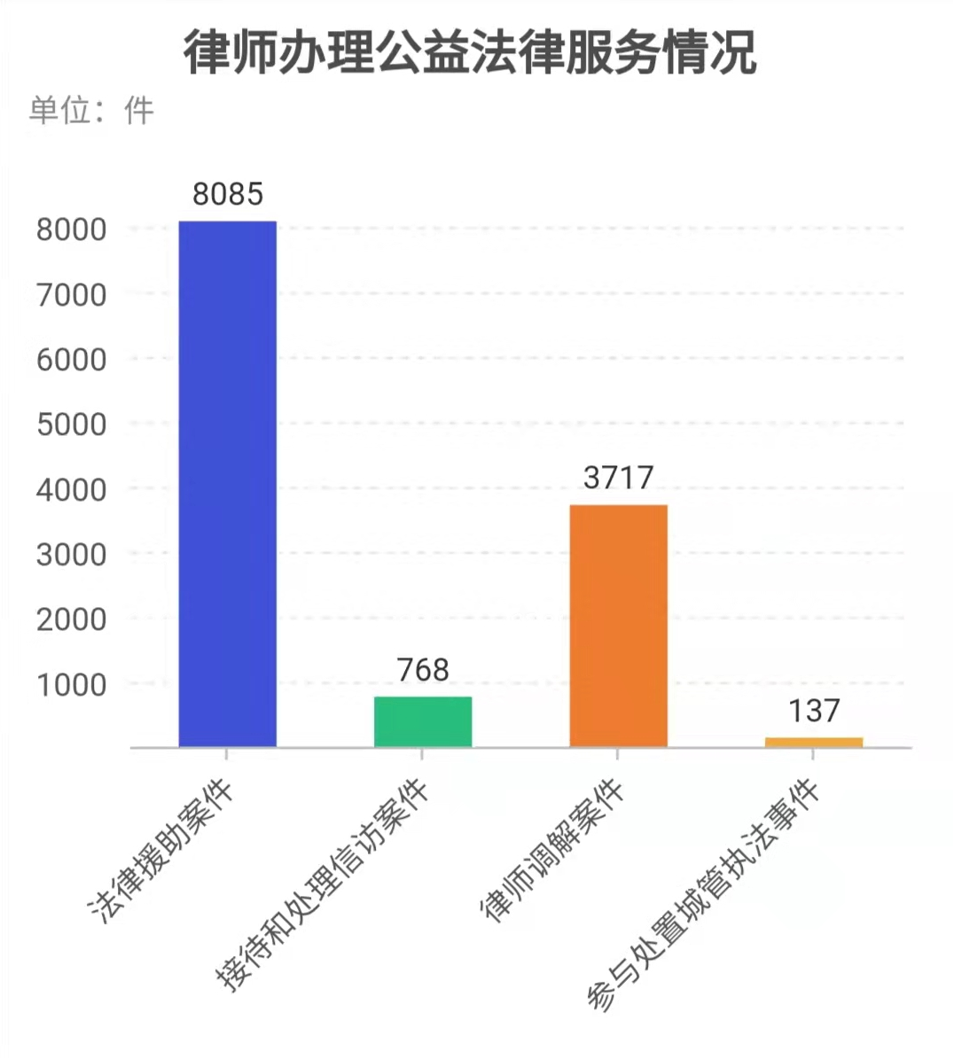 办理诉讼案件共计72627件,担任刑事案件辩护人、代理人10119件。代理民事案件58489件;代理行政案件3507件,代理申诉512件。办理非诉讼法律事务6693件。办理仲裁业务3267件,其中劳动争议仲裁2775件,国内商事仲裁492件。办理涉外法律服务案件13件。办理公益法律服务案件12707件。担任法律顾问6149家,其中担任党政机关、人民团体法律顾问510家,担任企业法律顾问4736家,担任事业单位法律顾问574家,其他329家。- 4 -