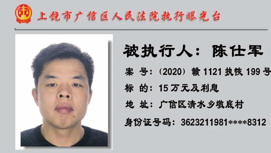 上饶市广信区人民法院根据《中华人民共和国民事诉讼法》第二百五十五条之规定,陈仕军等11名失信被执行人,拒不履行生效法律文书确定的义务,现将其具体信息公布如下,欢迎广大市民予以监督、举报。