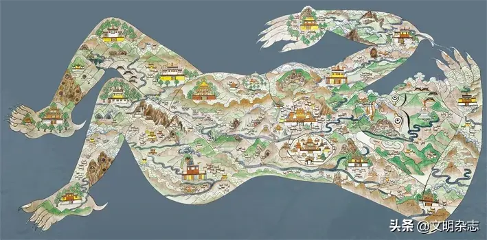 魔女仰卧图,西藏20世纪,纸本彩绘,拉萨罗布林卡藏。传说西藏的大地下横卧着一位巨大的罗刹女。松赞干布时,文成公主告诉尺尊公主,需要在罗刹女手脚处建立12座寺院以镇住她,此件画作即描绘了吐蕃王朝建立之初的这个传说。