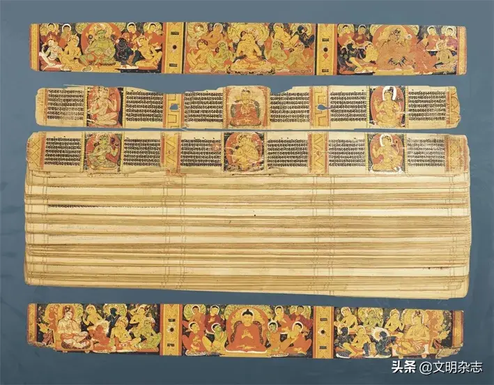 梵文《八千颂般若波罗蜜多经》,印度帕拉王朝11世纪后期,贝叶墨书彩绘,经夹板木质雕刻彩绘,山南雅砻历史博物馆藏。古代印度没有纸张,通常将经典书写在贝多罗(pattra)叶上,称为“贝叶经”。其形状为横条形,书写好后迭起,上下以木板夹住保护,称为“梵荚装”。