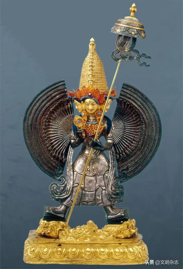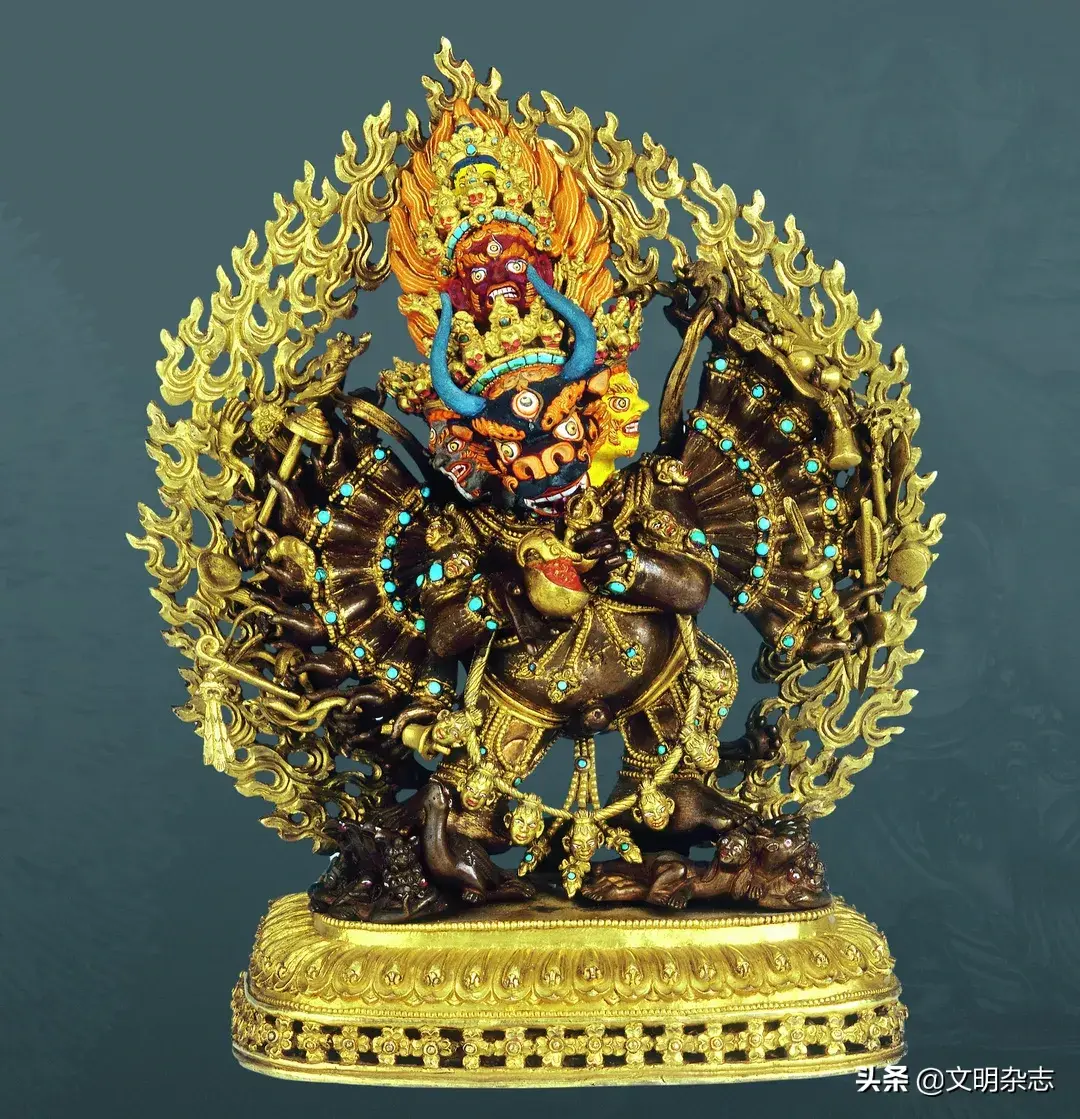 大威德金刚像,西藏15至16世纪,红铜,局部鎏金彩绘,拉萨罗布林卡藏。传说有一位岩洞的修行者在即将悟道之际,偷牛的盗贼闯入岩洞,砍了他的头,死神阎摩(Yama)借机附了身,把牛头按在自己头上到处在西藏残杀无辜。经过藏人的祈请,文殊菩萨化成与阎摩一样的牛头忿怒相降伏了阎摩,这尊大威德金刚即文殊菩萨所现的忿怒相。大威德有多种传承,此尊金铜像是最常见者。