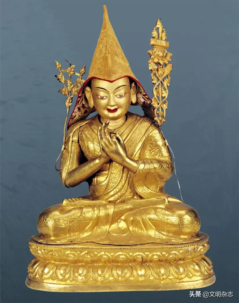 宗喀巴像,西藏18至19世纪,红铜鎏金,局部泥金彩绘,拉萨罗布林卡藏。宗喀巴,以阿底峡所传印度论师龙树大乘佛教中观派“缘起性空”思想为宗,综合各派显密教法,是为格鲁派祖师。