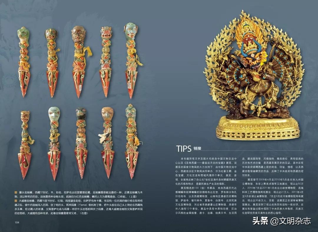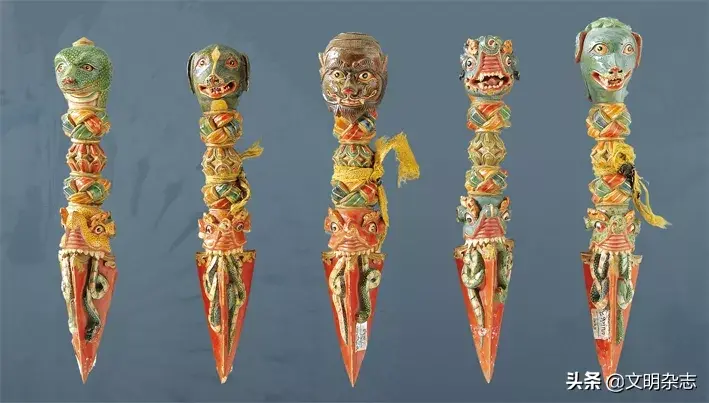 兽头金刚橛,西藏17世纪,木,彩绘,拉萨布达拉宫管理处藏。金刚橛是密教法器的一种,这套金刚橛为木制,涂以鲜艳的色彩。顶端是各种动物头部,底端均为红色金刚橛,橛的上方为摩羯鱼面,口衔蛇。