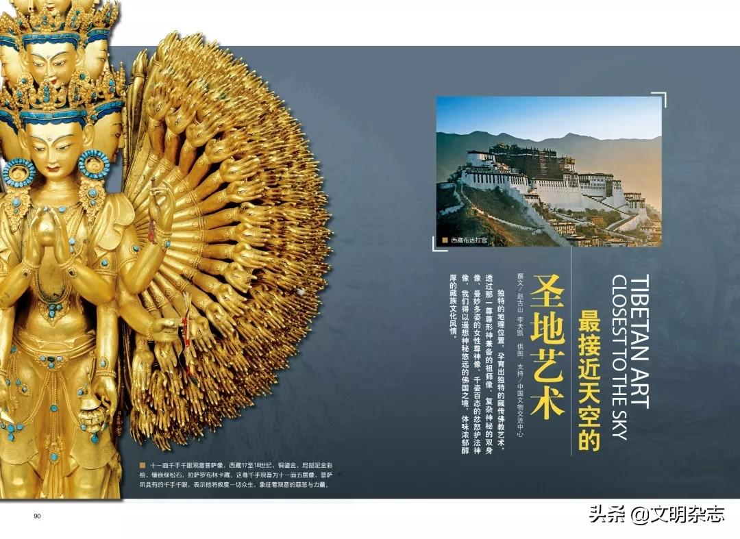 十一面千手千眼观音菩萨像,西藏17至18世纪,铜鎏金,局部泥金彩绘,镶嵌绿松石,拉萨罗布林卡藏。这尊千手观音为十一面五层像,菩萨所具有的千手千眼,表示他将救度一切众生,象征着观音的慈悲与力量。