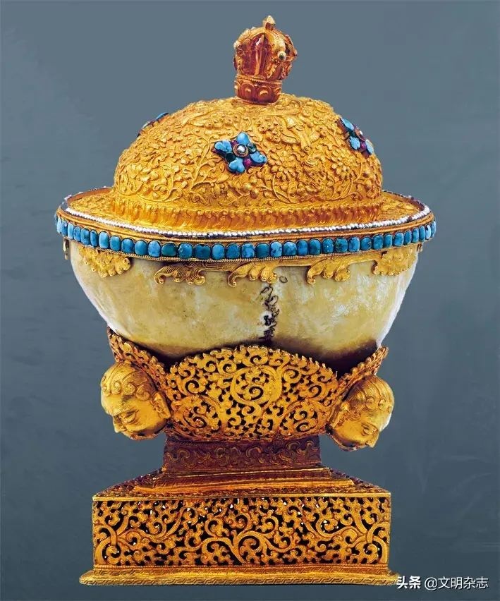 嘎巴拉碗,西藏18世纪,北京民族文化宫藏。此件为六世班禅罗桑贝丹益西所呈进,碗盖为铜鎏金,碗体为头盖骨。
