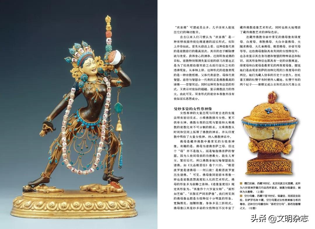 明妃和空行母像是藏传佛教中另外两种最为常见的女性尊神。明妃是指怛特罗佛教中双身修行中的女尊。因此,明妃一般没有单身供奉的情况,多是与主尊拥抱交接的姿态。明妃,梵音译“铄乞底”,这个具有婆罗门教色彩的本意为“槊”,是放在曼荼罗中修行的武器,具有威力、性力之意,在佛教后期作为明妃的概念则明显带有印度教性力派的影响。空行又称勇士空行,是藏传佛教中一类特殊的神。在性别上,空行包括男女两种,男性称为勇士,女性称为空行母。空行的形象非常独特,一般是单腿站立,脚下踩仰卧外道(佛教中将异教神称为外道),头戴五骷髅冠,腰间围兽皮,手执骷髅碗、钺刀等法器,常见多为女性形象的空行母像。